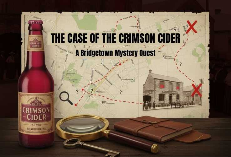 Investigate the 1919 Crimson Cider mystery in Bridgetown! Use the free ClueKeeper app on a 2.7km walking route. Solve puzzles, interrogate historic locations, and uncover