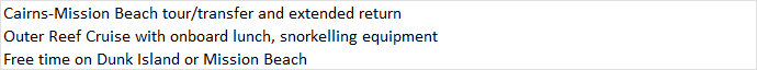 Cairns-Mission Beach tour/transfer and extended return Outer Reef Cruise with onboard lunch, snorkelling equipment Free time on Dunk Island or Mission Beach