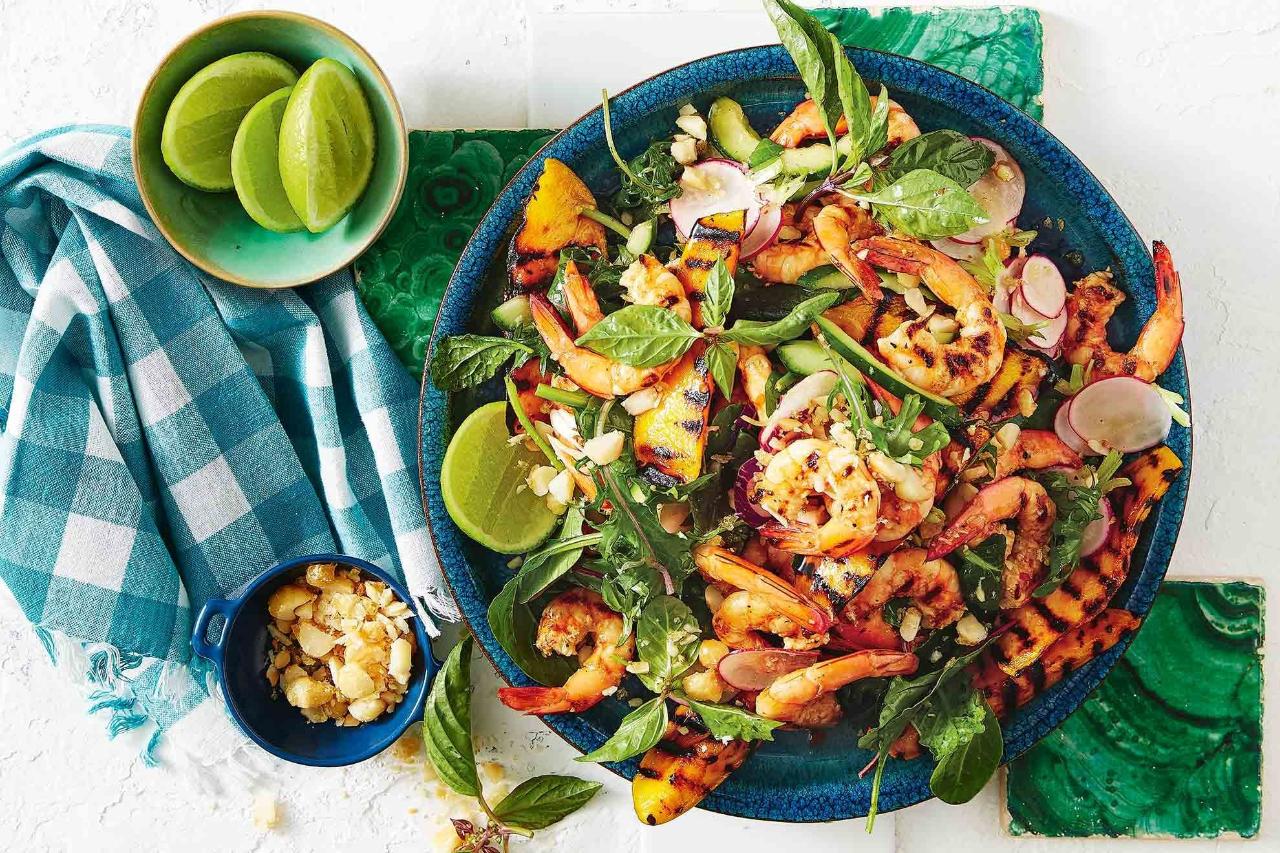 - BBQ Cajun King Prawns with Mango, Macadamia Nut & Lime and Coriander Salad