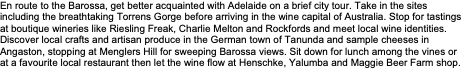 En route to the Barossa, get better acquainted with Adelaide on a brief city tour. Take in the sites including the breathtaking Torrens Gorge before arriving in the wine capital of Australia. Stop for tastings at boutique wineries such as Riesling Freak and Charlie Melton, meet local wine identities. Discover local crafts and artisan produce in the German town of Tanunda and sample cheeses in Angaston, stopping at Menglers Hill for sweeping Barossa views. Sit down for lunch among the vines at Vintners or at another favourite local restaurant then let the wine flow at a variety of iconic wineries such as Henschke, Yalumba, Rockford and Maggie Beer Farm shop.