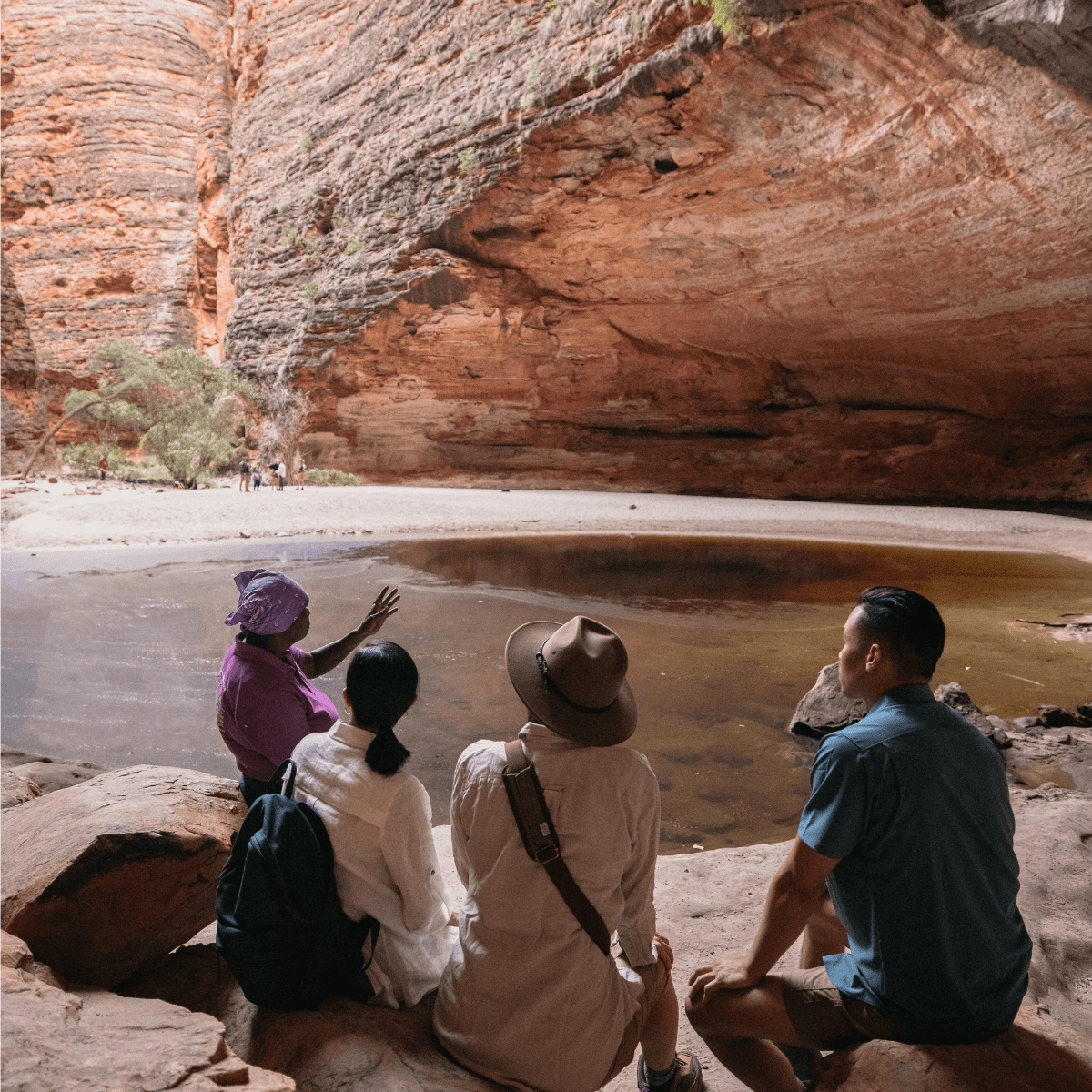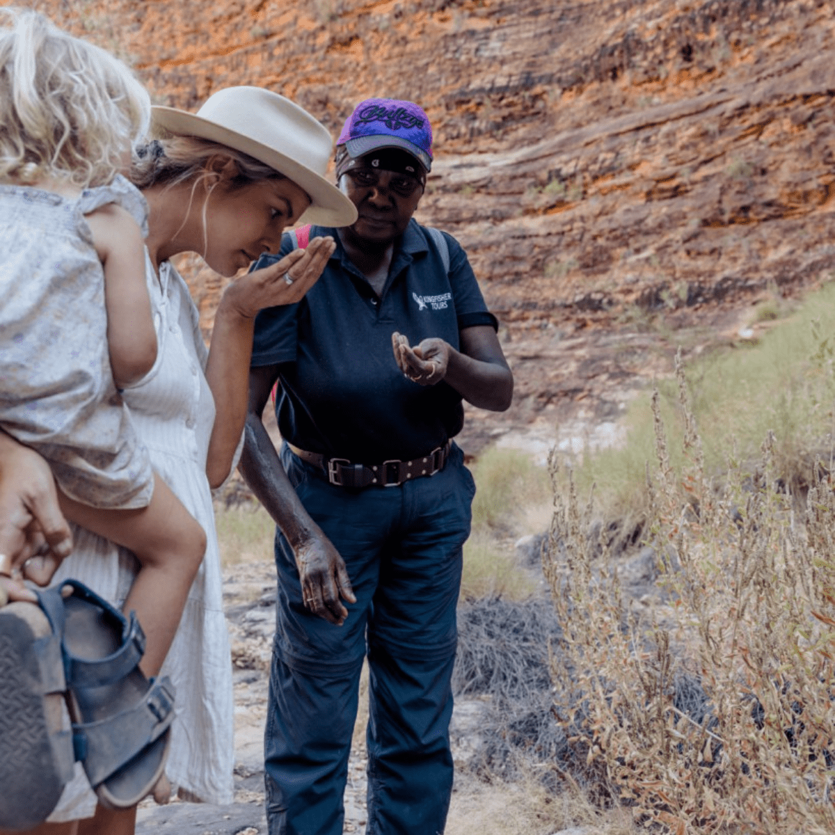 Bec, a local Gija woman, welcomed us with morning tea, including her freshly baked delicious damper. We then drove with her for approx 15mins to the Bungle Bungles. Her tour was incredible. Not only did we learn about the rock formations, but also her culture, customs, ceremonies & history. When Bec sang a Welcome to Country for us at Cathedral Gorge, another 2 tour groups nearby suddenly fell silent & listened. They like us were transcended to another world. We were certainly fortunate to have Bec from Kingfisher Tours as our guide through The Bungle Bungles. The other tour groups were lucky to be nearby & enjoy Bec's Welcome.