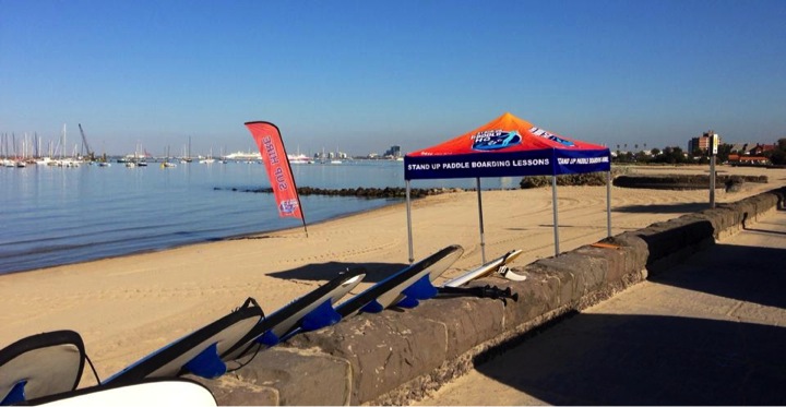 Where to meet us: We conduct all lessons and hire from our white and orange Stand Up Paddle Boarding Van (not a shop) which is parked right on the water’s edge, either at (1) the start of the St Kilda Pier, or (2) on Pier Road, St Kilda West Beach (located 150 metres on the right hand side of the St Kilda Pier), right near the Royal Melbourne Yacht Squadron. Both locations are only 100 metres apart. About 95% of the time, we will be set up at St Kilda Pier. Look out for the Paddle Boarding Van and black trailer, blue paddle boards, an orange tent and orange flags on the beach. Please don’t hesitate to call us on 0416 184 994 if you require some directions.