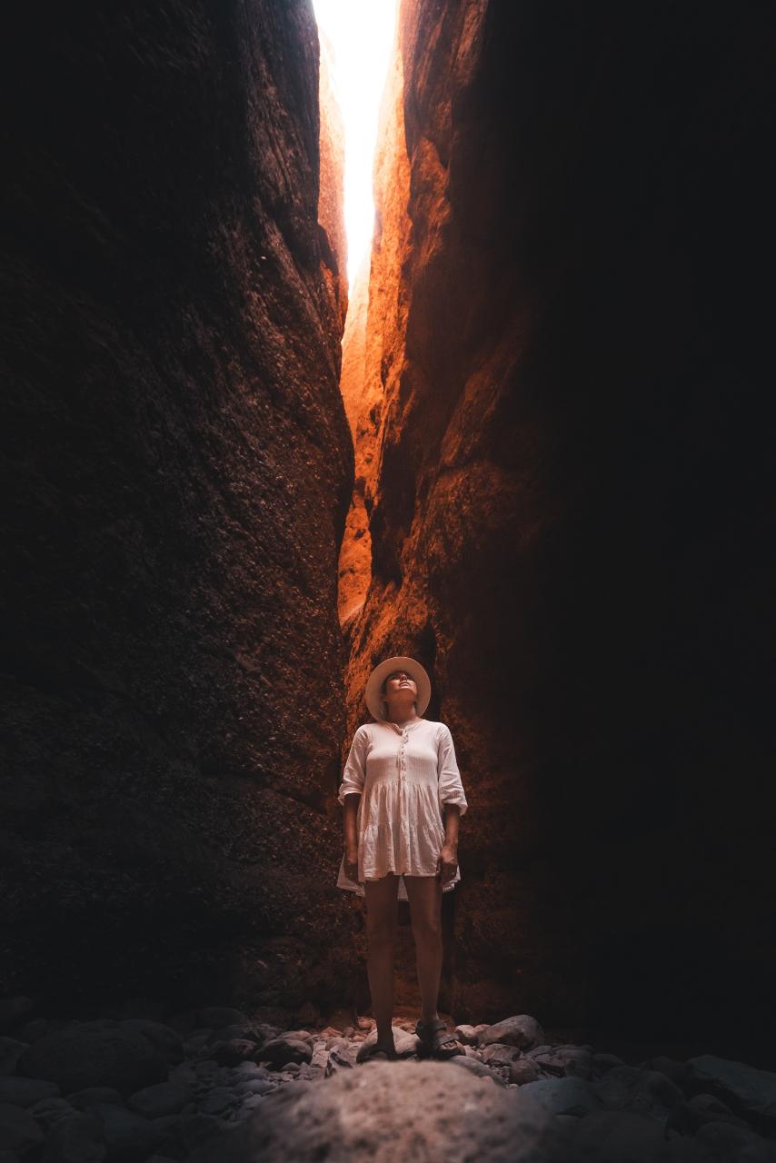 From here we made our way over to Echidna Chasm, which is at the other end of the park. It felt like we were entering ‘Jurassic Park’ as we made our way along the dry river bed, with majestic red rocks and massive palm trees towering over us as we entered the Echidna Chasm. Bec stopping and telling us stories along the way, she sang here too.