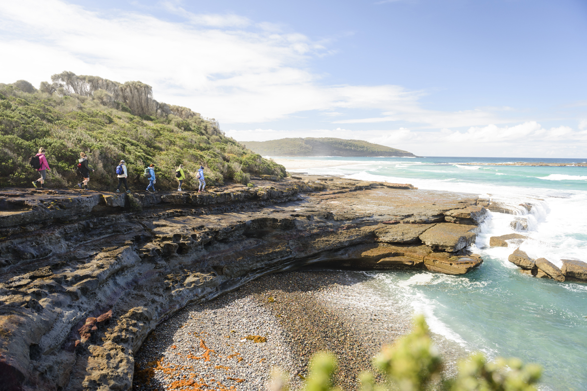 Your guides will pick you up from your Batemans Bay accommodation and transport you to the village of South Durras. Starting here you will traverse ancient geological sections, sandy beaches, rainforest, lake crossings and remarkably diverse landscapes. Head off the beaten path under towering eucalyptus canopies and emerge onto clifftops with breathtaking vistas, along the way, pause for delicious meals and hot drinks in secluded pockets of National