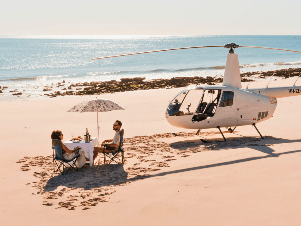 Experience the beauty of the Australian coastline with a scenic flight north of Broome over the world-renowned Cable Beach and Willie Creek. As you take in the breathtaking views from above, you’ll land on your very own secluded beach, where we’ll prepare an intimate dining setup just for you. Imagine a beautiful gourmet beach picnic, complete with chairs, table, and shade umbrella against the stunning backdrop of the Indian Ocean while the sun begins to set.