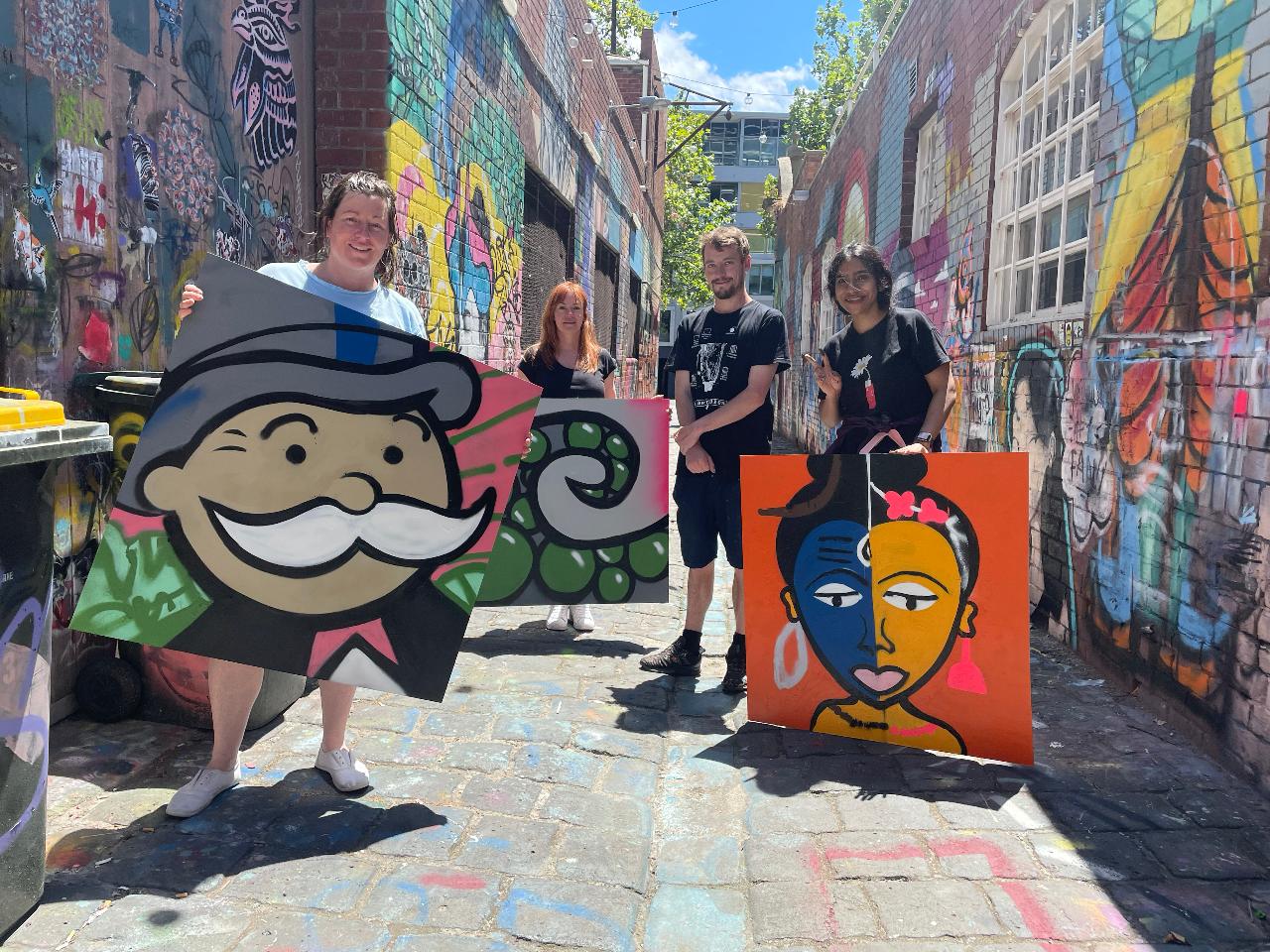 A spray-paint can is a challenging tool in comparison to other paint mediums and our artist is here to guide you through all the insider tricks of the trade. After a few practice activities where you will experiment with different techniques in our dedicated spraypainting venue, participants will then head back to the classroom for a short sketching and design session. Armed with your design, you will then head back outside to create our final masterpiece for the day. This workshop is perfect for anyone looking to develop their can control and learn spraypainting techniques for street art and muralism.