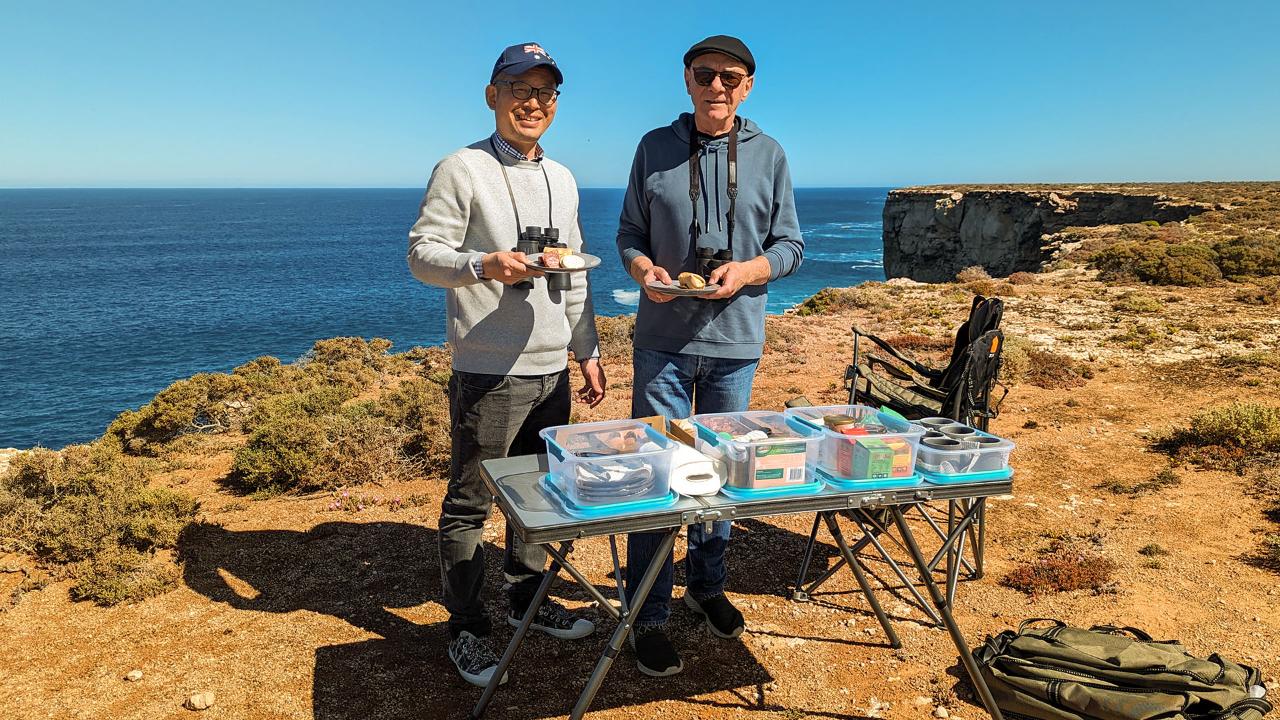 His vehicle was clean, comfortable and well maintained. The two meals provided had high quality and delicious offerings in generous helpings and there was also the bonus of hot boiling water for our beverages. Collapsible chairs, proper crockery and cutlery were provided to enable leisurely enjoyment of the view on Eyres Bluff.