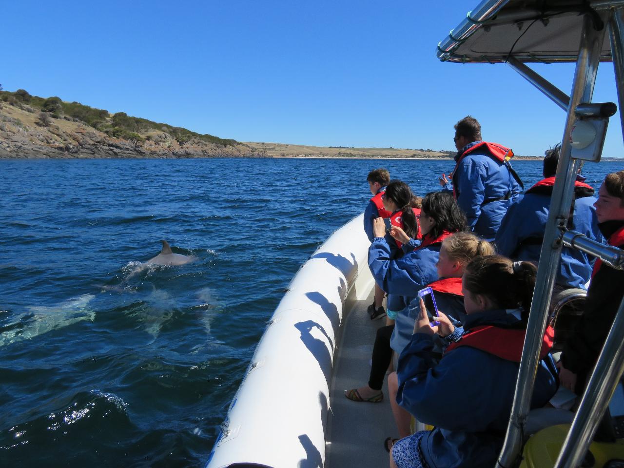 The pristine waters of Backstairs Passage and the rugged coastline seen from seaward make the two hour Ocean Safari well worthwhile, but the dolphins make it very special. Elijah and Bonnie make a great Skipper and Deckie respectively, apart from a minor 550 nautical mile navigational glitch confusing the SA mainland with Tasmania ..but we did make it back in the end.