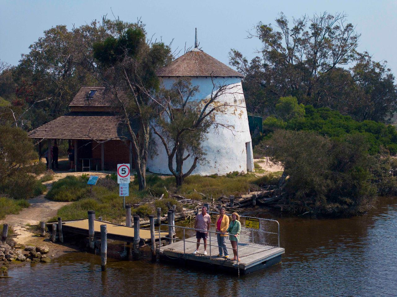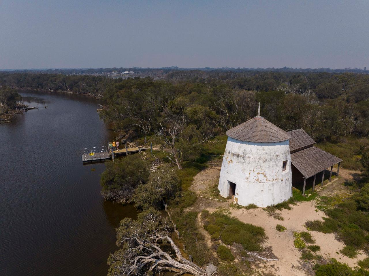 • On entering the Murray River, stop at Cooper’s Mill heritage island site for a brief, easy walking tour. This restored wind-driven mill, located on Cooleenup Island, built by the first European settlers, is only accessible by boat. Explore and wander, or follow our tour guide to learn more about the Mill, native flora and bush tucker on the island.