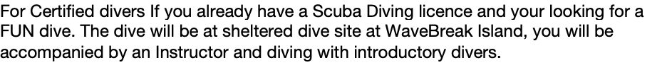 For Certified divers If you already have a Scuba Diving licence and your looking for a FUN dive. The dive will be at sheltered dive site at WaveBreak Island, you will be accompanied by an Instructor and diving with introductory divers.