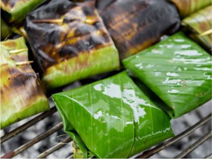 Chilean grilled fish wrapped in banana leaf with chili and lime