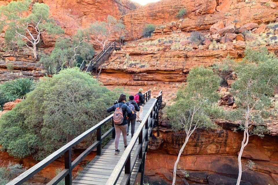Meals: Breakfast, Lunch, Dinner. Camping: Private Kings Canyon Campsite – Permanent Tents or Bush Swags (communal bathroom facilities). Driving Distance: 406 km (4.5 hours). Hike Distance: 2-6 km (2-4 hours, weather permitting).